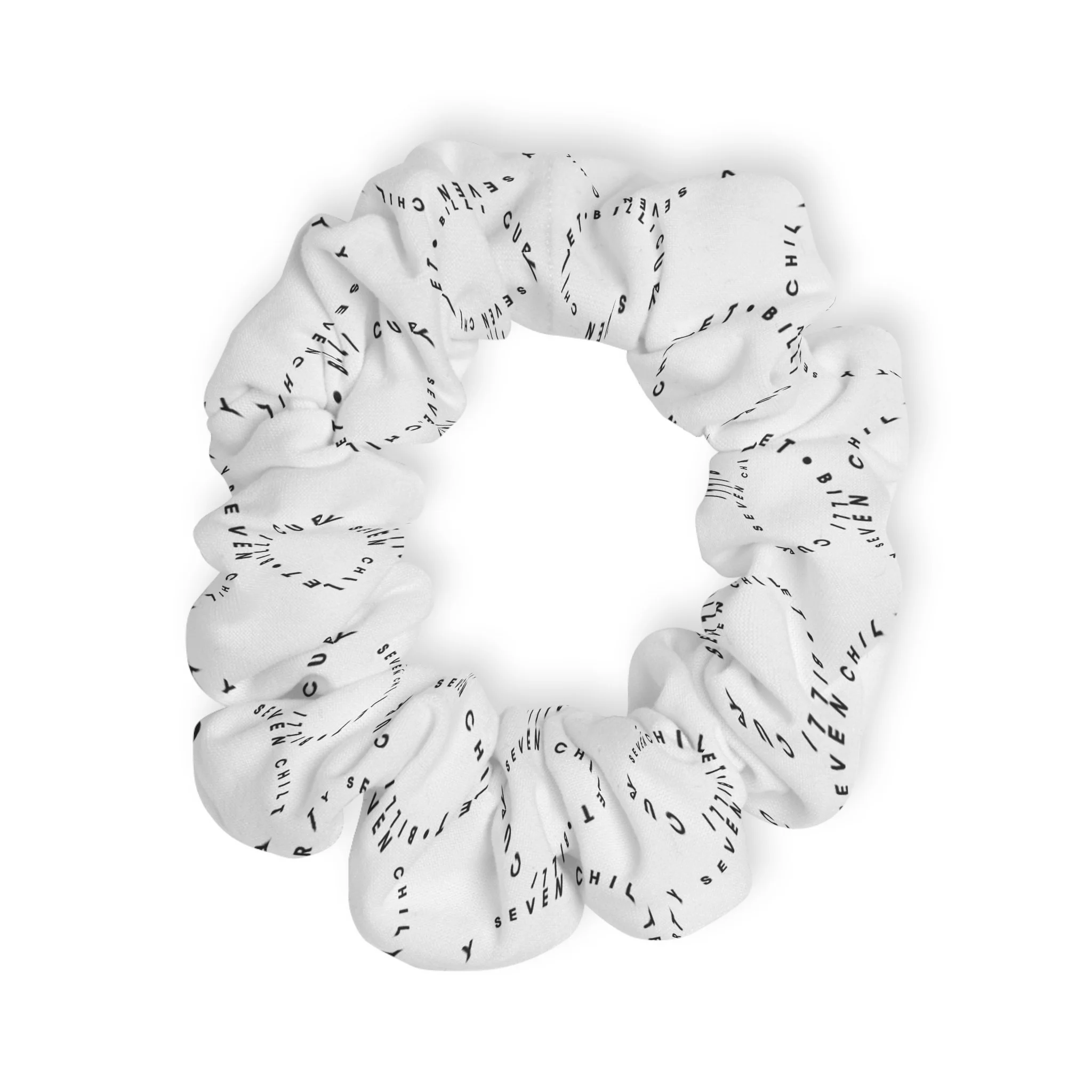 Lightweight and lively, this jersey-knit scrunchie brings a breezy note to everyday hair styling. The soft 100% polyester fabric keeps shape and color wash after wash, while the hidden elastic gives a gentle, secure hold without tugging. The all-over printed design in crisp, vibrant ink turns a simple accessory into a chic accent—subtle black lettering on clean white makes it easy to mix with wardrobe staples. Slip it on a wrist between errands or use it to gather a low bun for a polished, lived-in look.